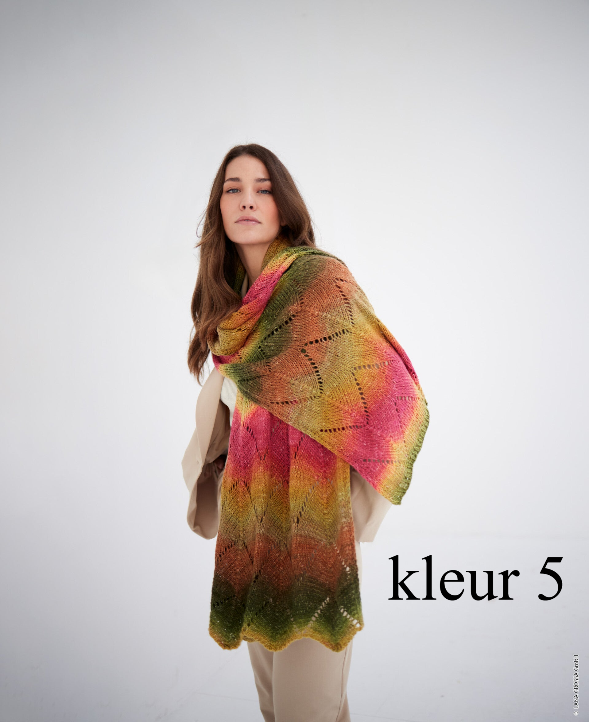 Breipakket sjaal inajour golfpatroon van Lana Grossa Cotonella. 100 % katoen 280 meter op 100 gram Voor deze sjaal is 4 bol gebruikt en deze is op naald 5 gebreid.