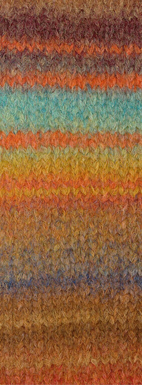 Gigante Multi van Lana Grossa 70 % alpaca 30 % polyamide. Naal6 steekverhouding 13 steken en 187 naald = 10 x 10 cm. Op een 50 grams bol zit 150m. en voor een trui maat 38-49 heb je ong. 6 bol nodig