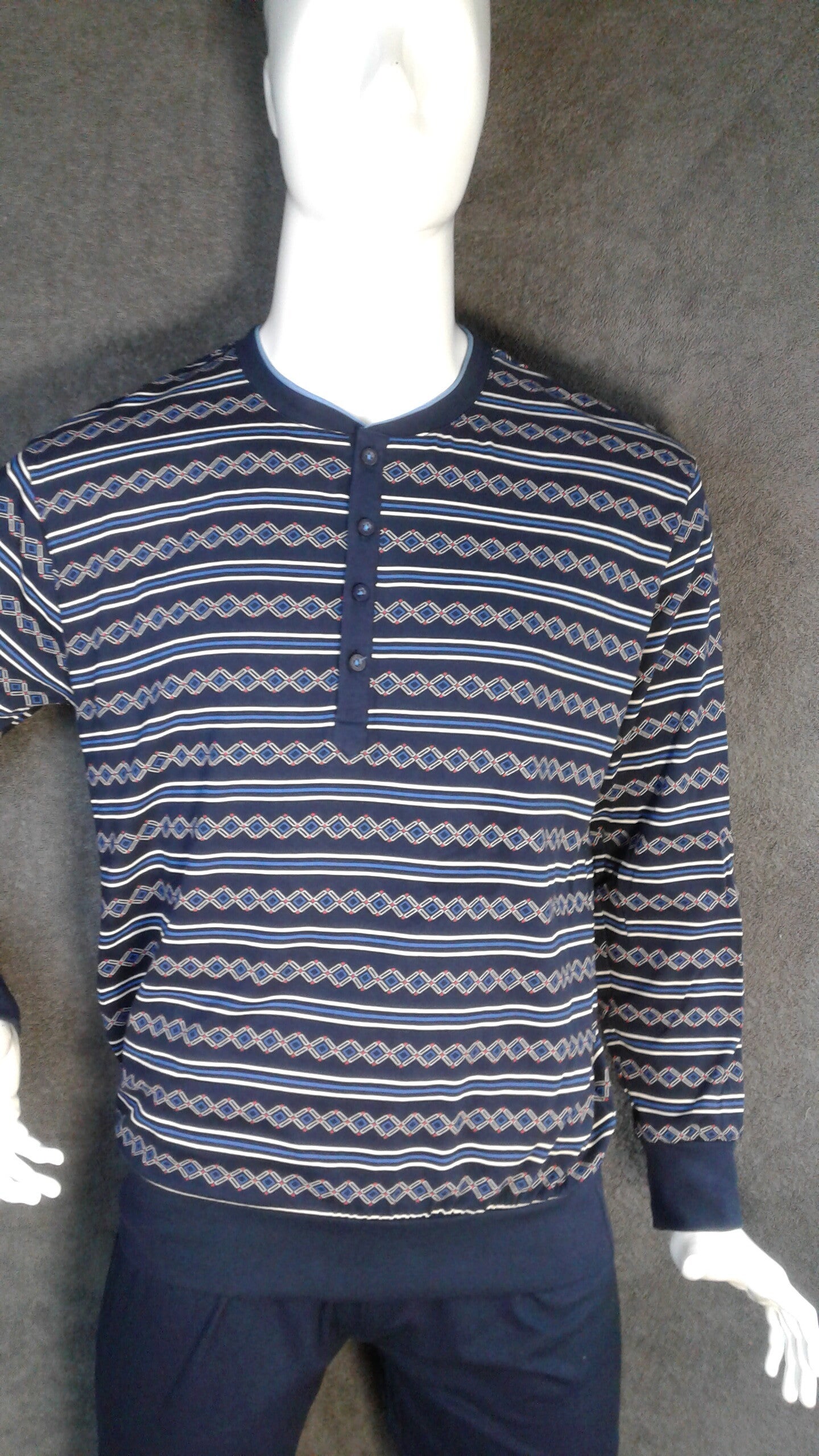 Heren pyjama Pastnette 100 % katoenen jersey, me tknoopsluiting van 3 knoopjes en ronde hals en tricot boordjes aan mouwen en broekspijpen.