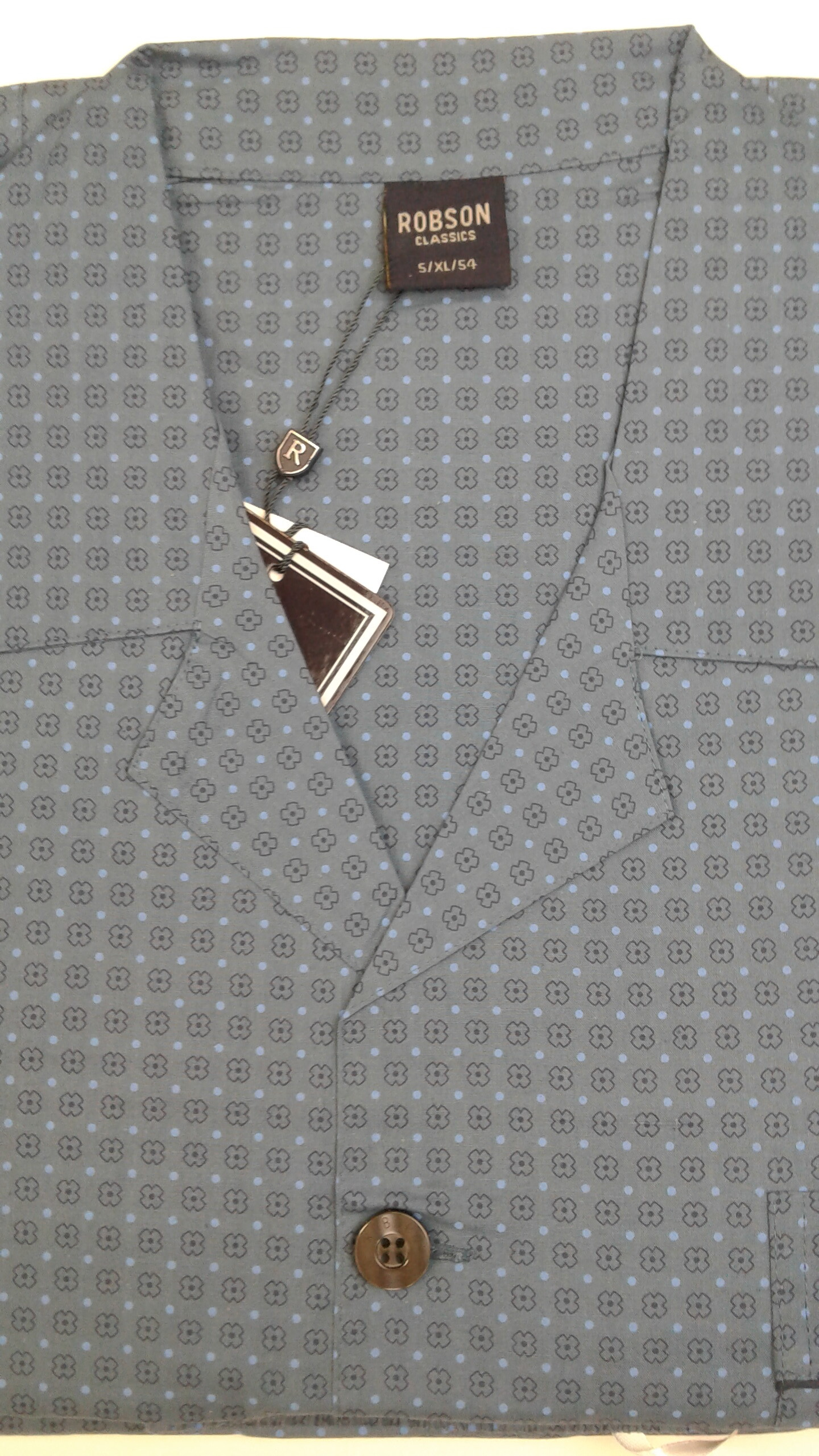 Heren pyjama Robson, 100 % katoenen poplin, jasje met kraag, knoopsluiting en 3 zakken. Broek met split en knoopsluiting op elastische boord.