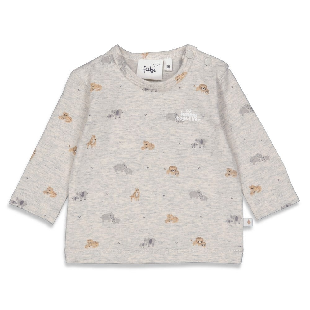 T-shirt Feetje 92 % biologische katoen 8 % modal(viscose) ronde hals met 2 drukknoopjes op schouder, kleine dieren print en tekst: so happy togheter