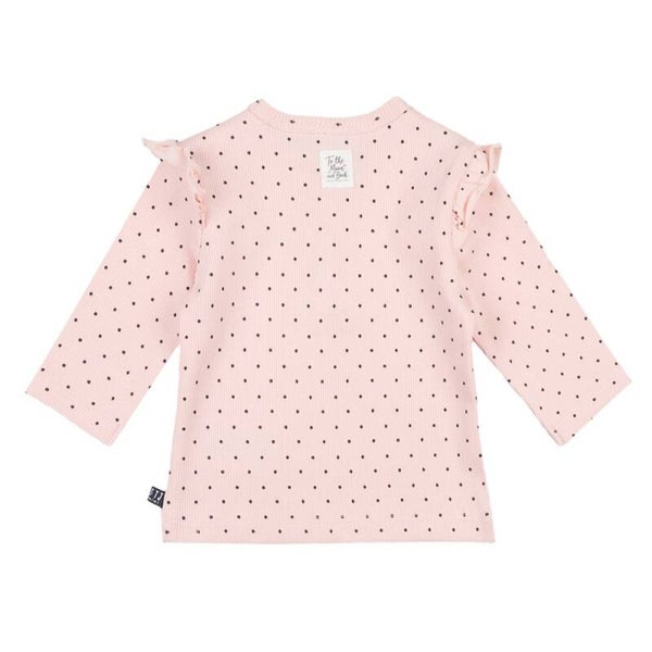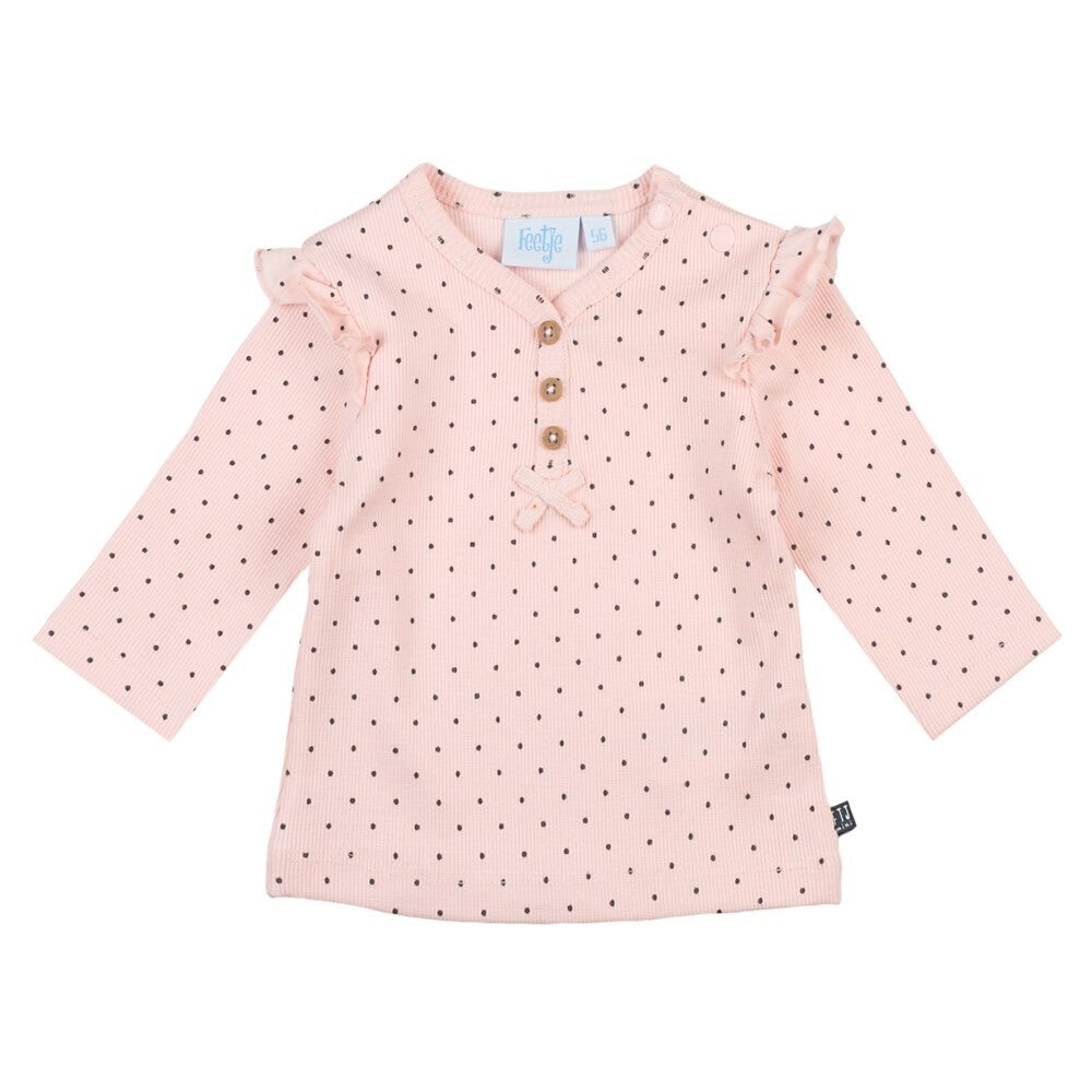 Baby shirt Feetje, roze met grijze nop, ruche langs het armsgat en 3 knoopjes op (nep) sluiting middenvoor. 2 drukknopen op de schouder