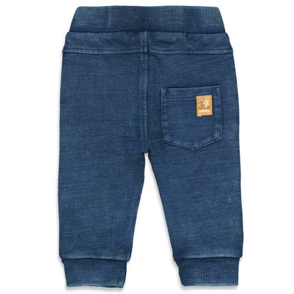 Tricot baby broek in jeanslook van Feetje, met boordjes aan de pijpen, 2 zakken aan de voorkant en 1 zak aan de achterkant, elastiek in de taille en een wit/blauw/bruin koord in de tailleband. Door het model en de wat "verwassen" blauwe kleur lijkt het net een jeans. 100 % biologische katoen.